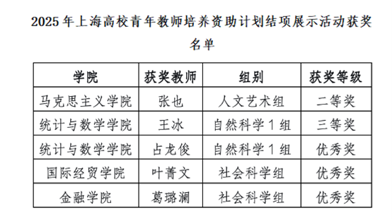 近日,上海市教育委员会、上海市教育发展基金会联合公布了2025年上海高校青年教师培养资助计划结项展示活动获奖名单。经学校遴选推荐、专家材料评审和现场展示等环节,我校五位青年教师凭借扎实的教学功底和富有特色的课程思政设计荣获多项奖项,展现了我校青年教师队伍优秀的育人素养与教学风采。