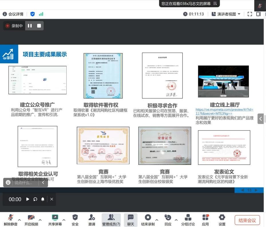 此次答辩会在线上开展,项目团队认真对待,积极准备,答辩人结合PPT围绕项目已取得的阶段性成果和收获、主要创新点及建设过程中的收获等方面进行汇报。